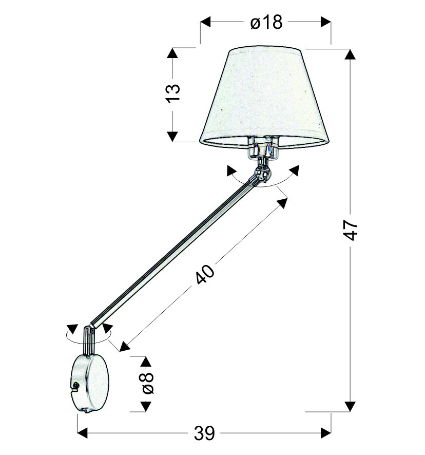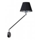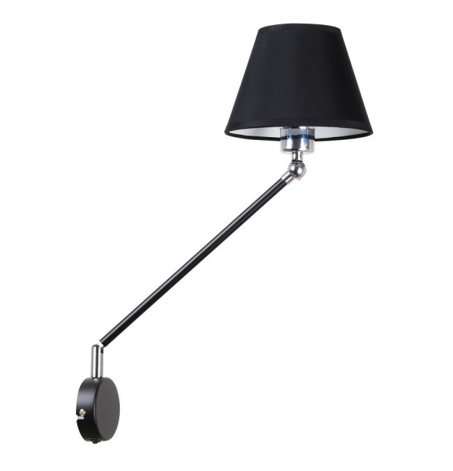 Nowoczesny kinkiet, który można kojarzyć z lampką gabinetową. Abażur z tkaniny + PVC na obrotowym ramieniu, podstawa stalowa na obrotowym ramieniu w kolorze czarnym. W przyściance zamontowany wyłącznik. Nasz kinkiet to wyrazisty akcent w Twoim domu!
