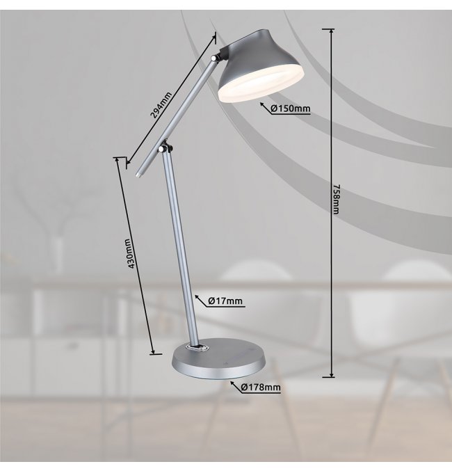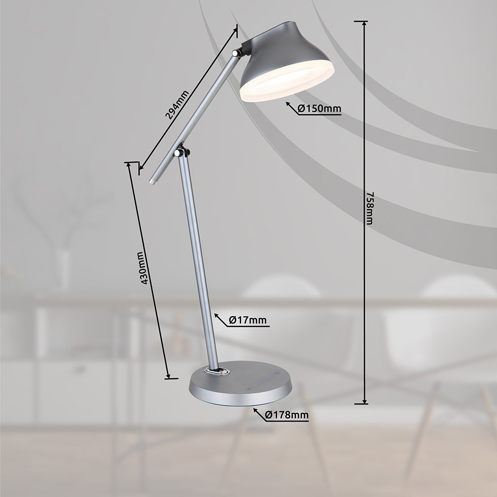 Lampa stołowa, aluminium szary mat, tworzywo sztuczne szary metalik, kabel PVC czarny, wył. dotykowy, ściemniacz, funkcja pamięci, wyłącznik czasowy, adapter, Szer*Gł*Wys: 432x178x758mm, przyłącz 1300mm, LED 8W 230V, 44-450lm, 4000K