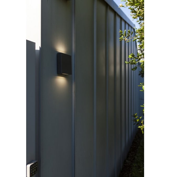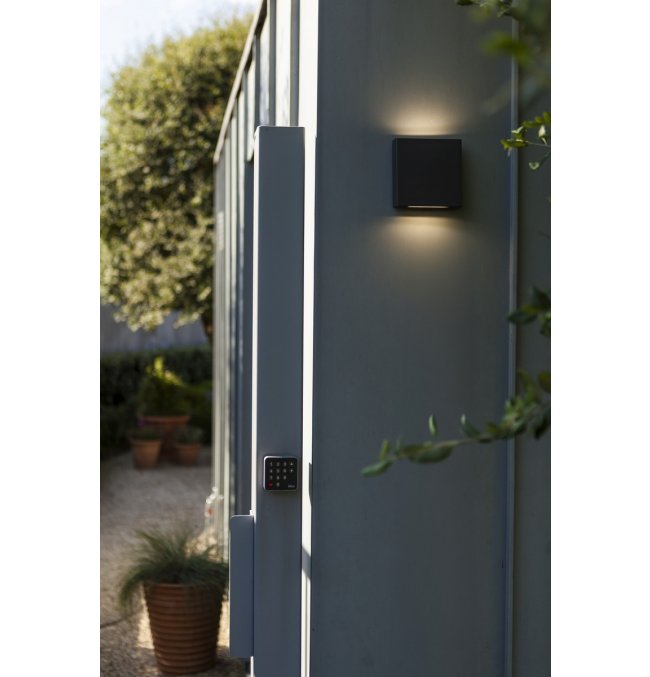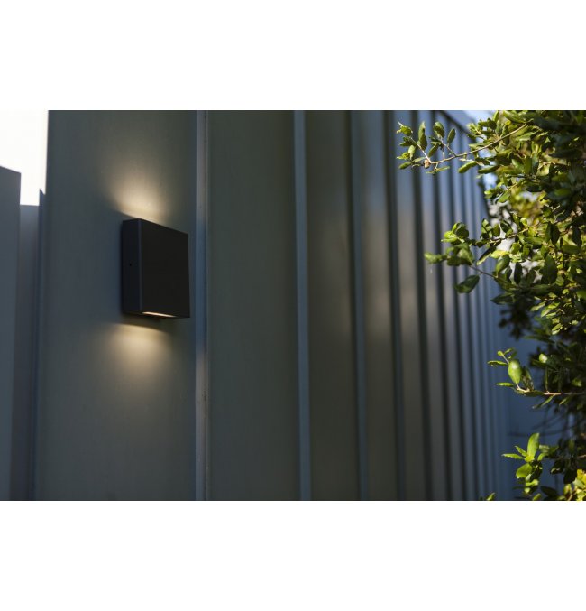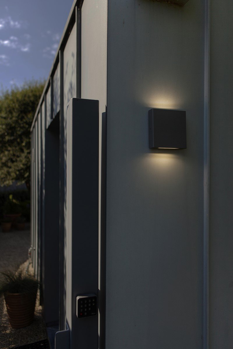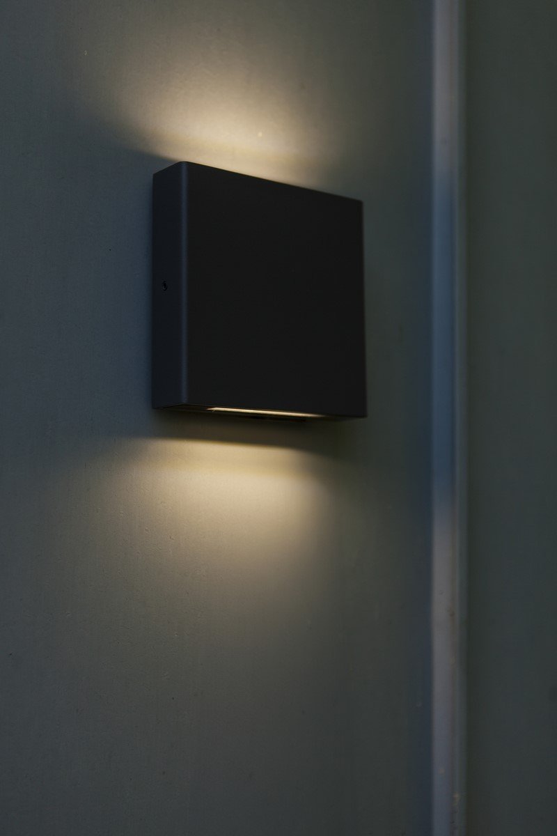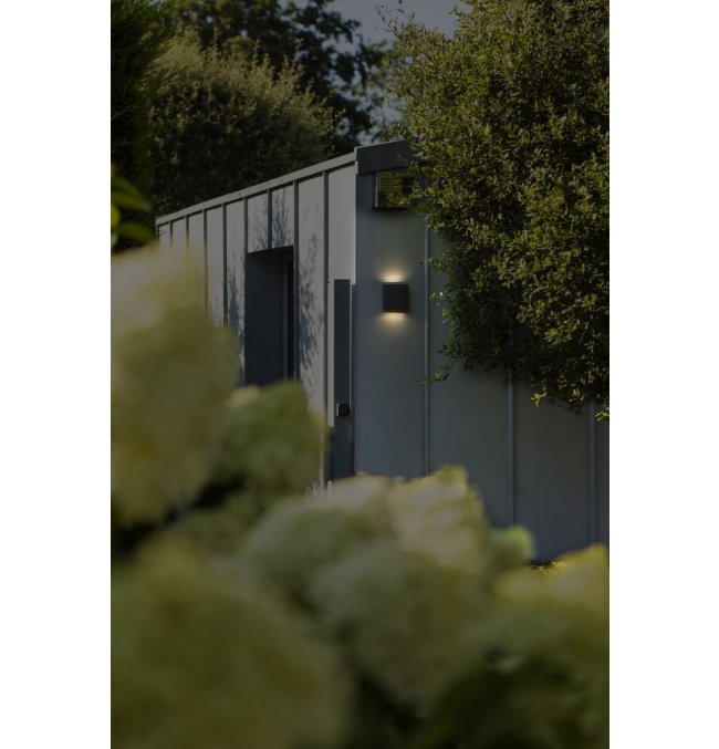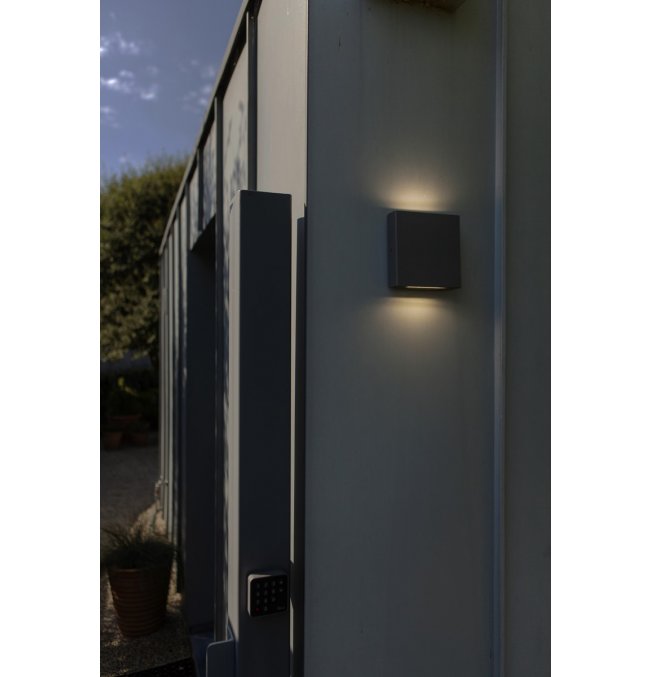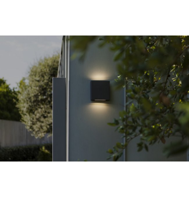 PILI to kwadratowa zewnętrzna lampa ścienna w ciemnoszarym kolorze, wyposażona w transparentny szklany dyfuzor, który emituje światło zarówno w górę, jak i w dół. Taki design zapewnia równomierne, stylowe oświetlenie.