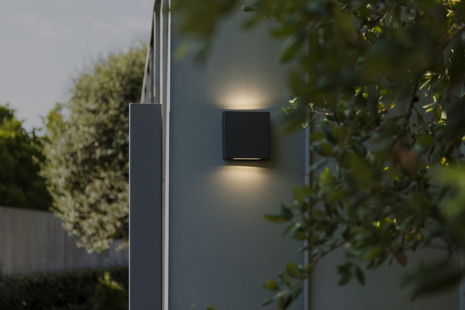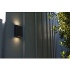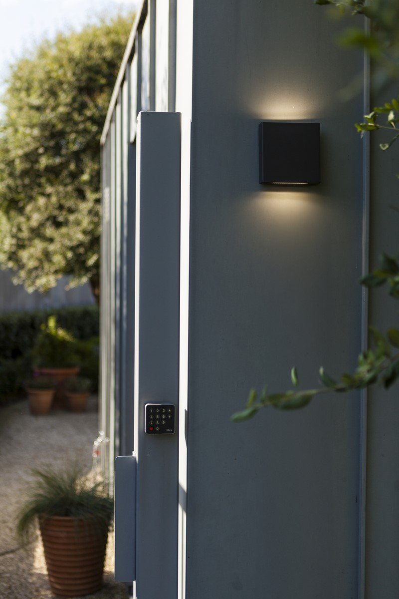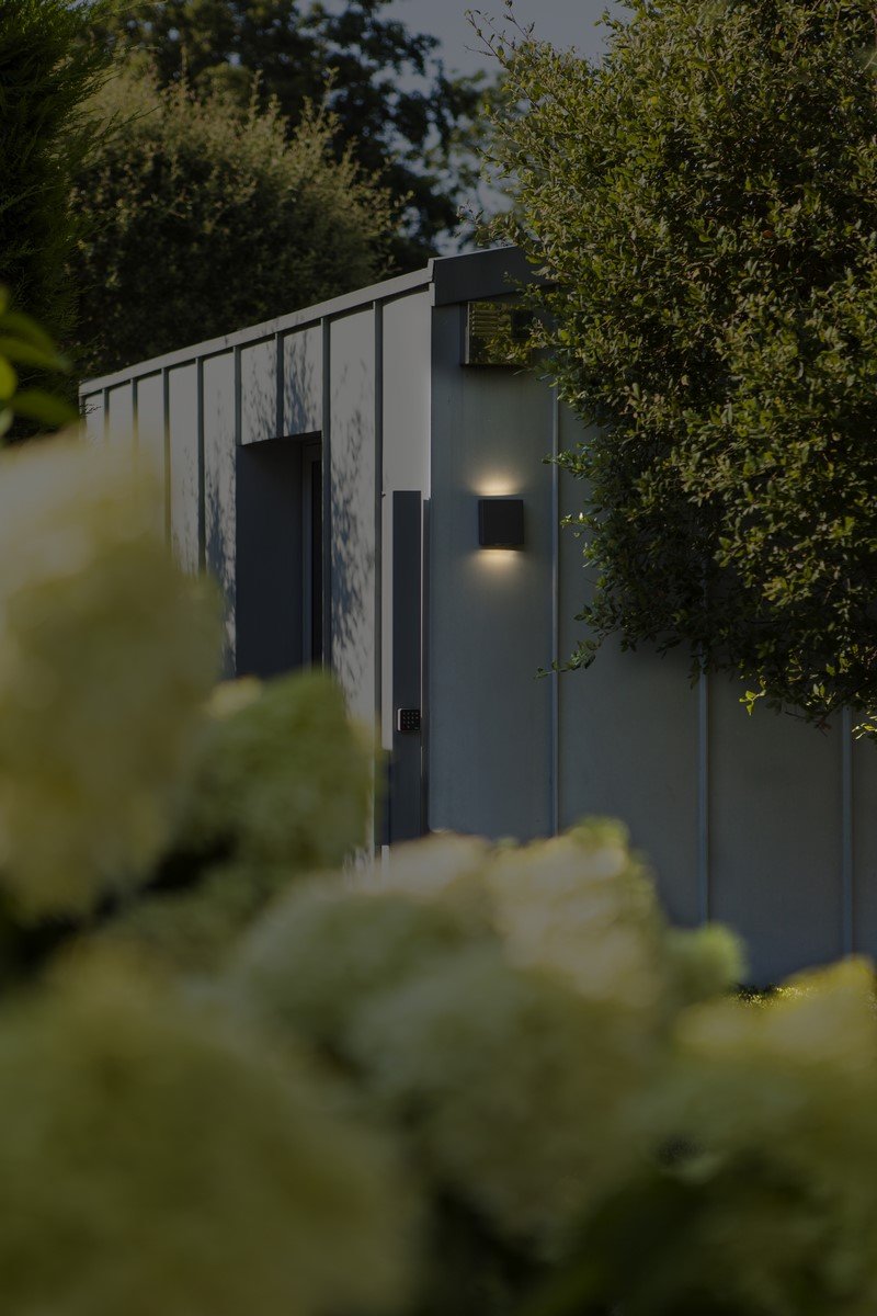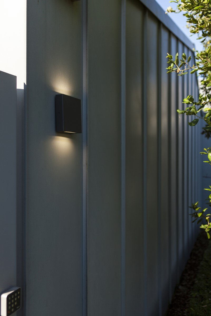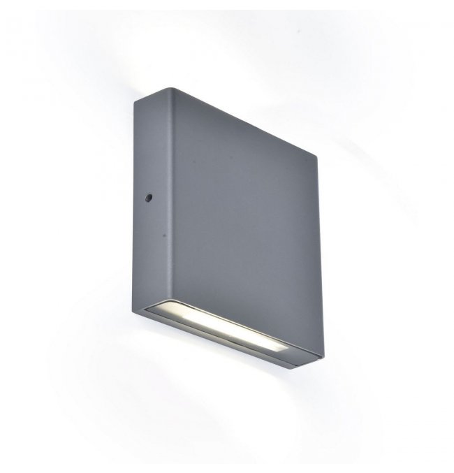 PILI to kwadratowa zewnętrzna lampa ścienna w ciemnoszarym kolorze, wyposażona w transparentny szklany dyfuzor, który emituje światło zarówno w górę, jak i w dół. Taki design zapewnia równomierne, stylowe oświetlenie.