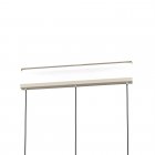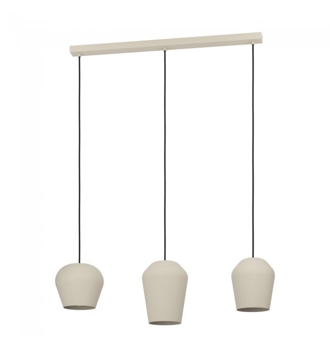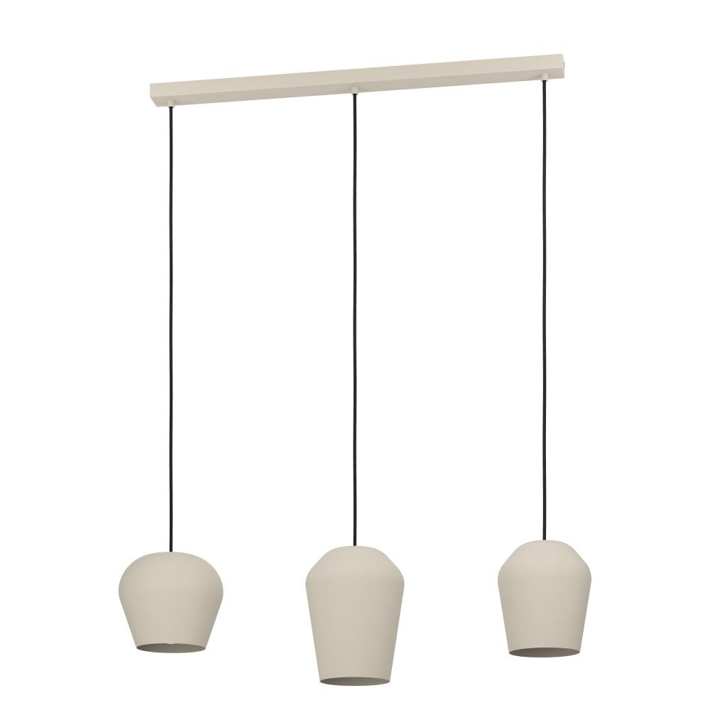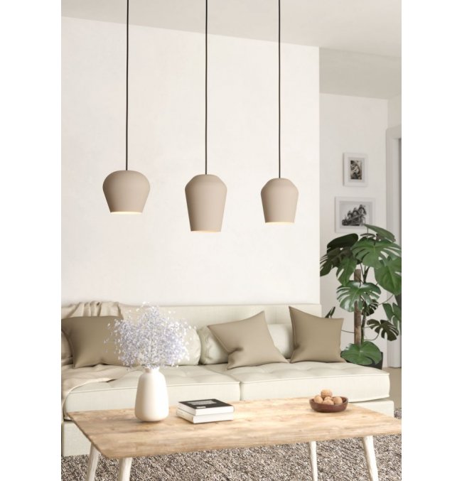 Lampa wisząca CAMBAITO jest wykonana z długiego, metalowego baldachimu w kolorze piasku, z którego trzy metalowe klosze tego samego koloru zwisają z czarnymi kablami tekstylnymi. Dzięki różnym kształtom trzy parasole zapewniają atrakcyjny, a jednocześnie harmonijny wygląd. Lampa wisząca o monochromatycznym designie płynnie komponuje się z nowoczesnymi stylami wyposażenia i oferuje stylowe oświetlenie w salonie lub jadalni, na przykład nad wydłużonym stołem jadalnym. Żarówki nie wchodzą w zakres dostawy. Lampa nadaje się do każdej lampy z trzonkiem E27.
