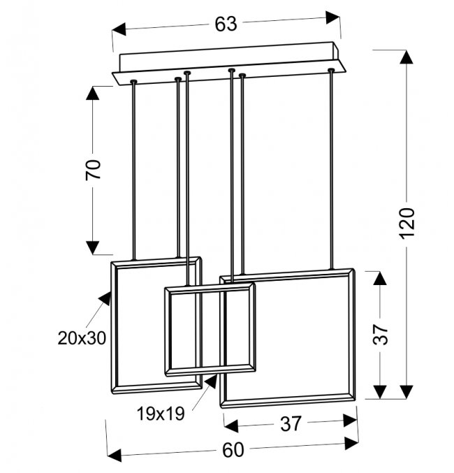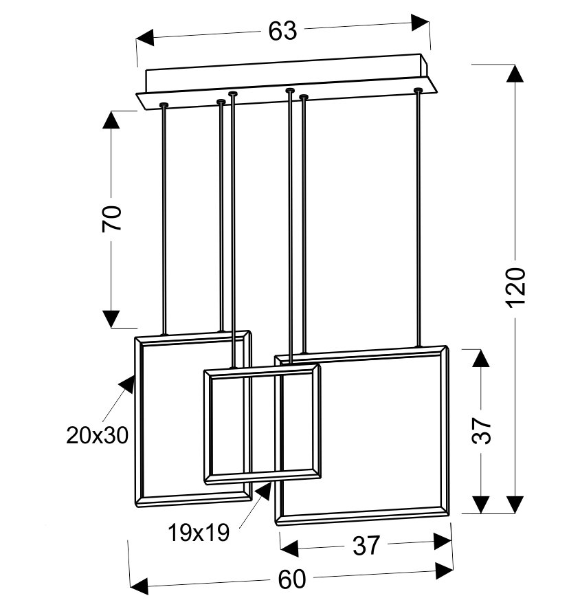 Produkt z ekskluzywnej linii marki APETI. Lampa wisząca o formie trzech kwadratów. Zawieszone na metalowych linkach dają złudzenie przywieszonych ramek na zdjęcia. Połączenie metalu o barwie białej i ledu daje pewność dopasowania się do każdego pomieszczenia, nadając obłędnego efektu.