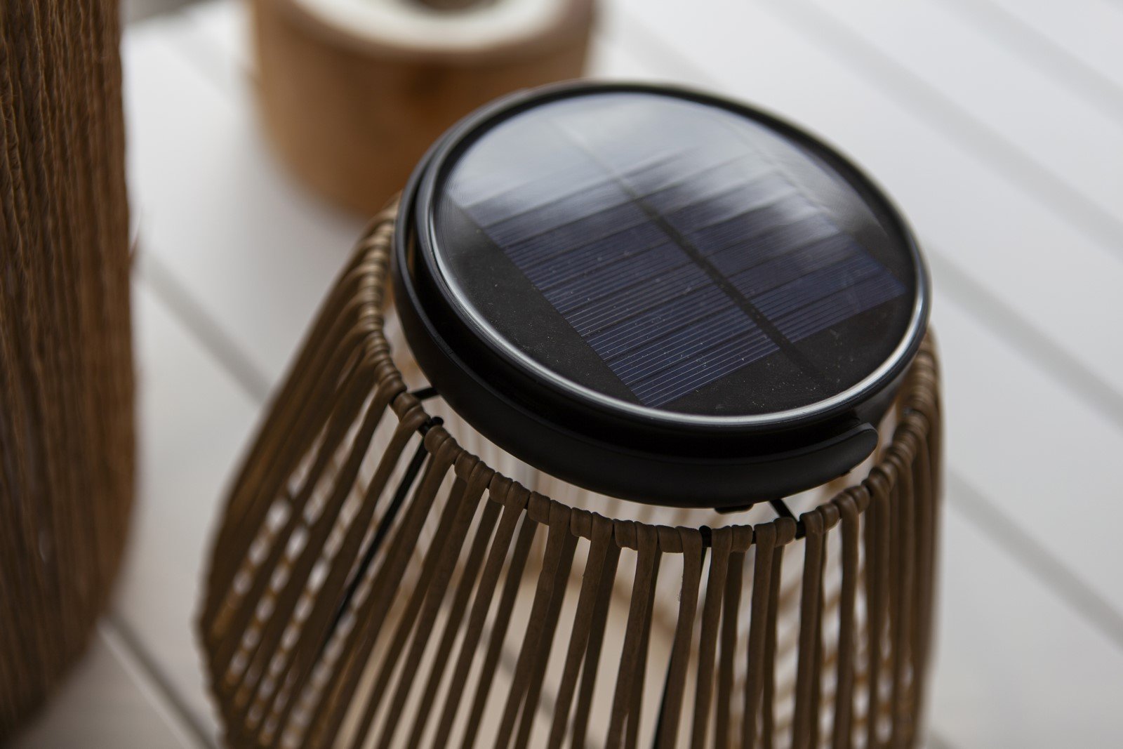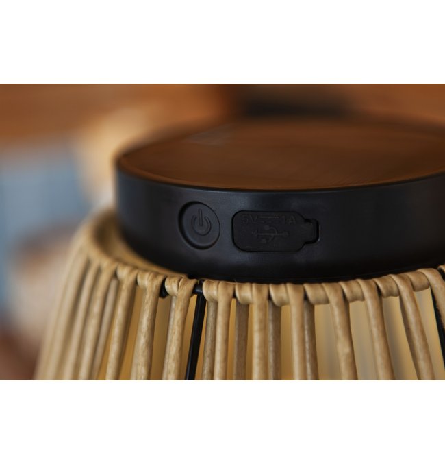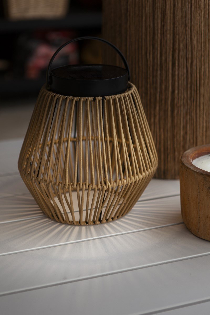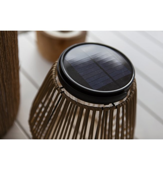 Przenośna lampa solarna COPPA to stylowy i przyjazny dla środowiska wybór oświetlenia, charakteryzujący się eleganckim czarnym wykończeniem uzupełnionym detalami z tkanego rattanu. Ta bezprzewodowa lampa zasilana energią słoneczną łączy w sobie estetykę z funkcjonalnością, dzięki czemu jest elegancką i wszechstronną opcją oświetlenia ogródka.