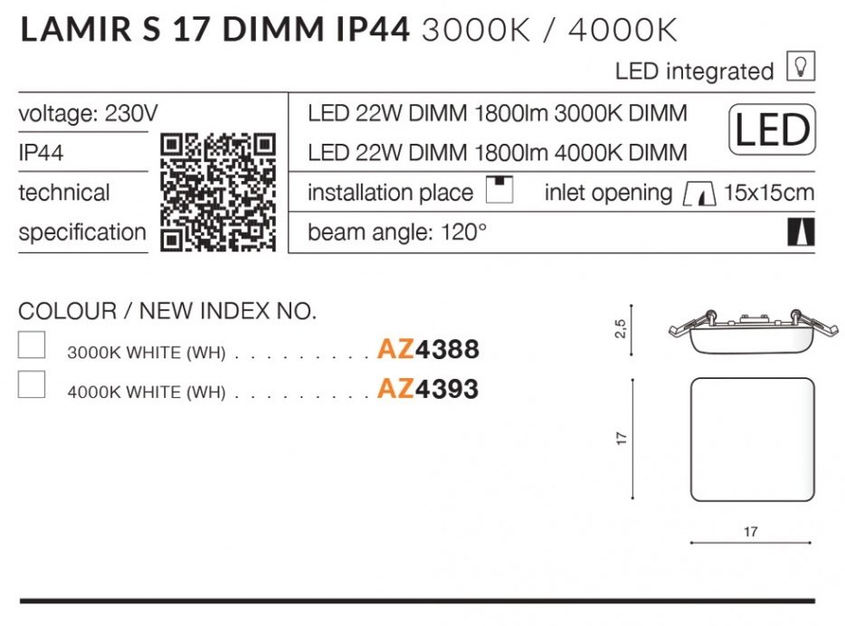 Plafon wpuszczany LED 22W IP44 LAMIR S 17 DIMM AZ4388 Azzardo